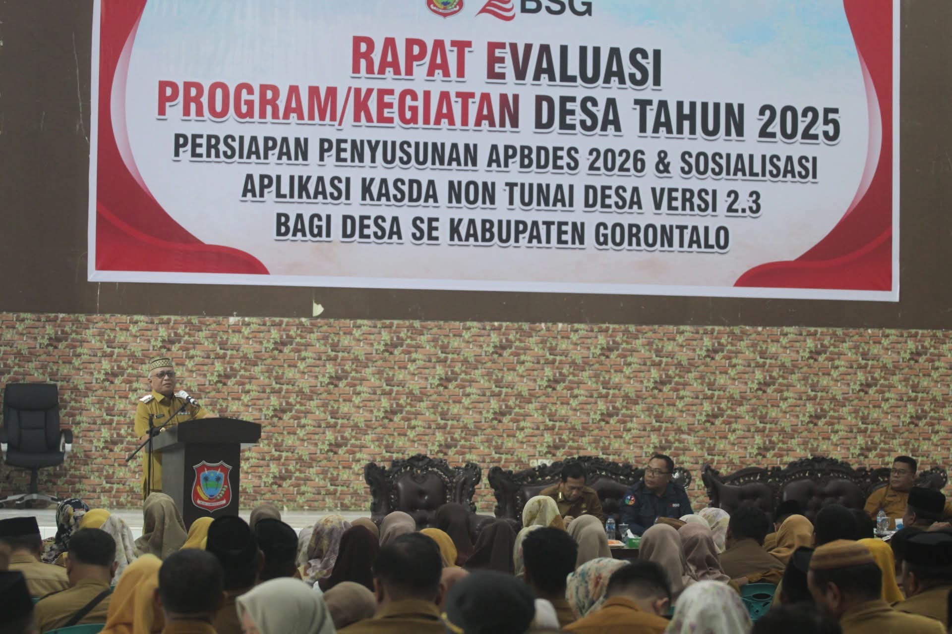Suaranet.com, LIMBOTO – Pemerintah Kabupaten Gorontalo melalui Dinas Pemberdayaan Masyarakat dan Desa (PMD) menggelar Rapat Evaluasi Program dan Kegiatan Desa tahun 2025, yang dirangkaikan dengan persiapan penyusunan Anggaran Pendapatan dan Belanja Desa (APBDes) tahun 2026 serta sosialisasi Aplikasi Kasda Non Tunai Desa Versi 2.3.